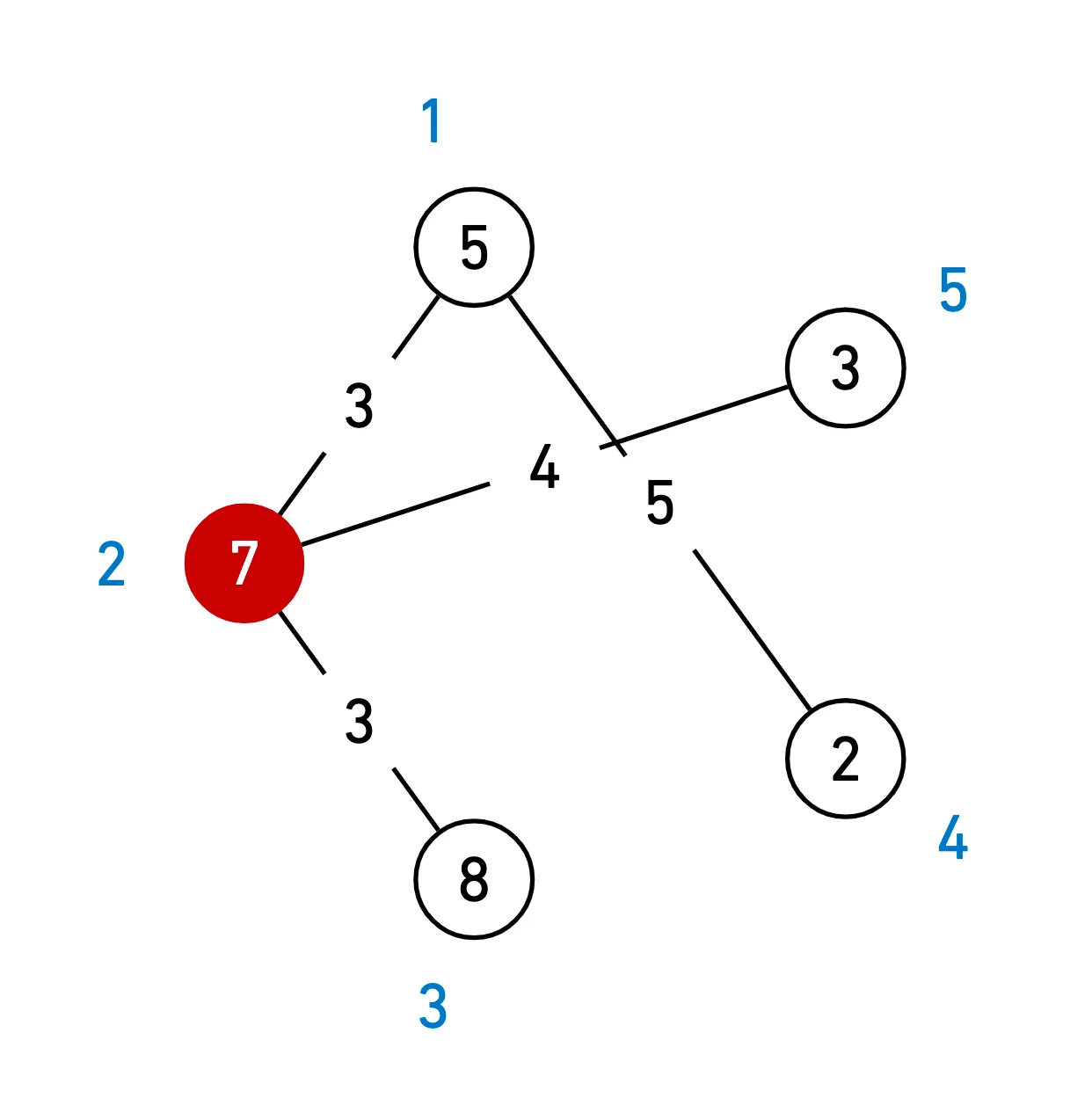 ( 원 밖의 숫자는 지역 번호, 안의 숫자는 아이템 수, 선 위의 숫자는 거리를 의미한다)