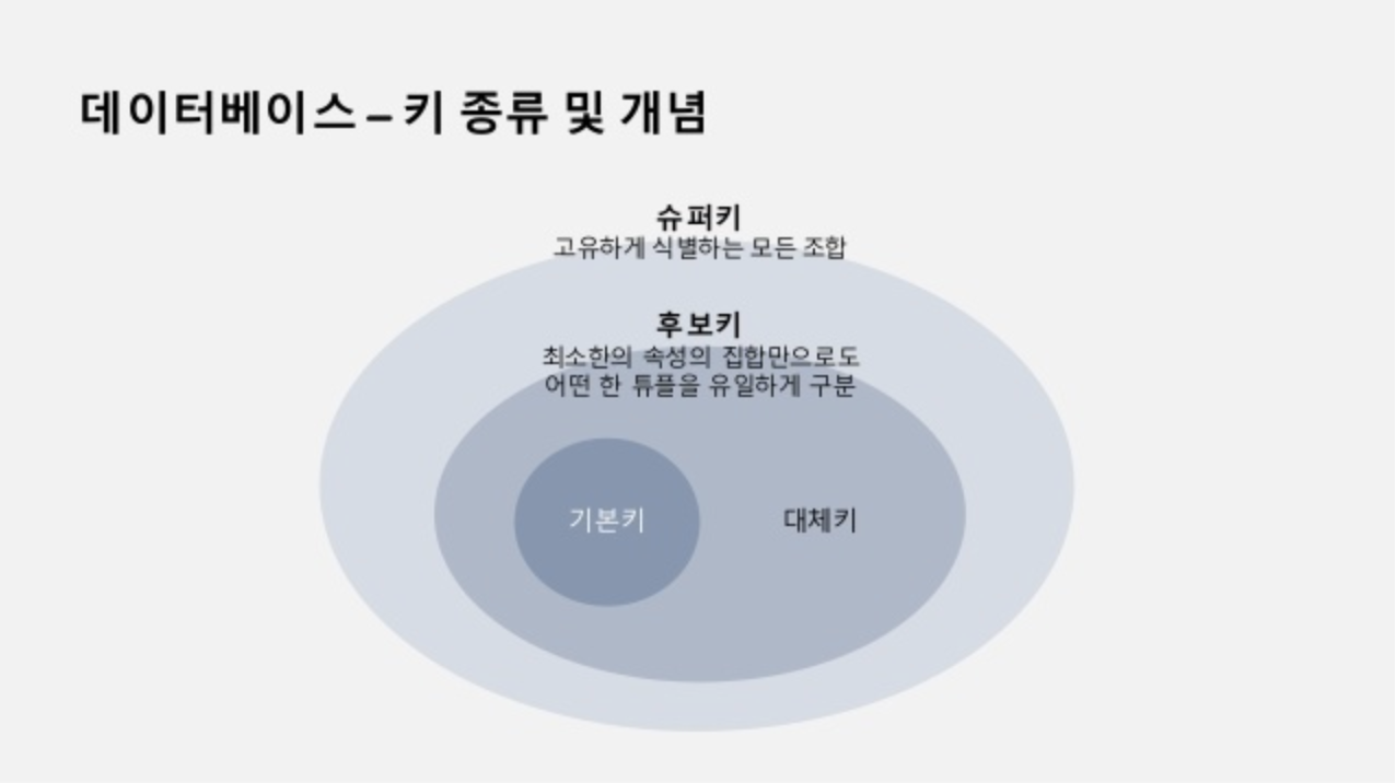 🟨 목 차 🟨 1. Key 란 ? 1-1. 슈퍼키(Super Key) 1-2. 후보키(Candidate Key) 1-3. 기본키(Primary Key) 1-4. 대체키(Alternate Key) 1-5. 외래키(Foreign Key) 저번 시간에는 데이터의 성격을 정의하는 테이블 제약