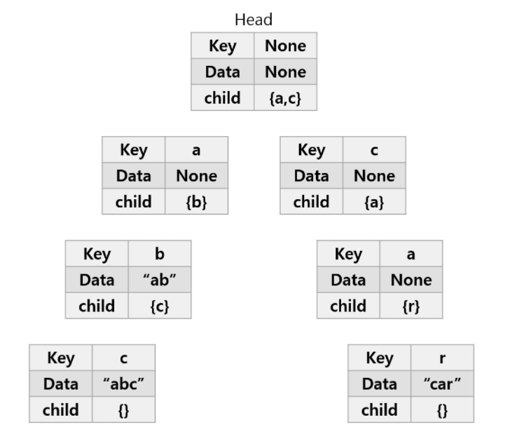 헤드의 자식 'a' 존재 -> 'a' 노드로 이동