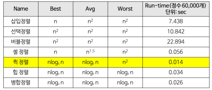 퀵 정렬: 기준을 정하고 중심축보다 작은 요소를 왼쪽으로, 큰 요소를 오른쪽으로 보내는 작업을 여러 차례 반복하여 정렬하는 방식