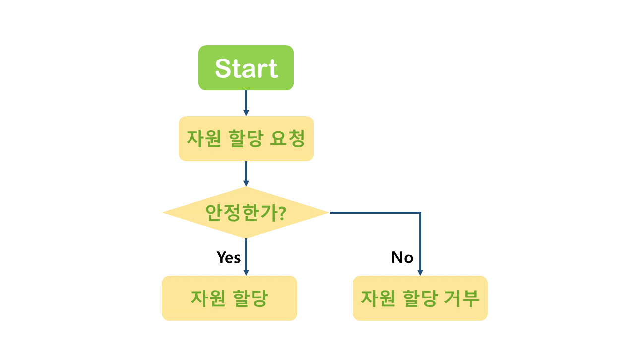 리소스 요청을 허락해줬을 때 데드락이 발생할 가능성이 있으면 리소스를 할당해도 안전할 때까지 계속 요청을 거절하는 알고리즘